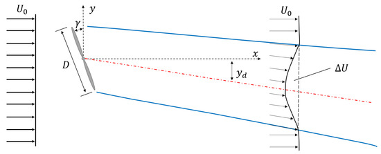 Here, represents the yaw angle, D represents the diameter of turbine (illustrated in Figure 1), is the ambient turbulence intensity, and is the coefficient of thrust under no yawing conditions. In this form, Equation (3) is applicable in the far wake region.