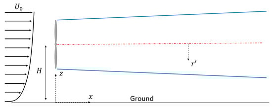 Here, H is the hub height; is the wake deflection, and its expression depends on its location within the wake. In the near wake region, is assumed to be linear with distance downstream of turbine and is expressed as