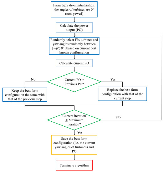 The core idea behind the proposed algorithm is to improve solution quality based on best known solution during the optimization process. Thus, instead of determining the yaw angle, , the algorithm determines an incremental yaw angle with respect to the current yaw angle. This incremental yaw angle is randomly selected from a range of to , where the value of is predefined. As shown in Figure 3, the algorithm starts with the determination of the power output of a farm with all non-yawed turbines, which is considered as the initial farm configuration. This initial configuration is considered to be the best known configuration. Then, the yaw configuration of the farm is changed by yawing of the turbines to angles ranging from to . After that, the power output of the farm with new configuration is calculated and compared to that of the best configuration. If the new configuration produces higher power production, then the best known configuration will be replaced by the new configuration. Based on the best known solution, the turbines will yaw additionally and randomly between the range of and and compared with the previous solution. This process is repeated for a specified number of iterations. In other words, the yaw angle of a turbine i, , will be the sum of all the random angles chosen between and from previous iterations. For example, suppose , and turbine 1 yaws (random selected between to ) from the initial yaw angle of relative to the wind in the first iteration, then yaws (random selected between to ) from its current yaw angle in the second iteration, so the yaw angle of the turbine after two iterations is , if both configurations produced higher larger power output than previous configurations.