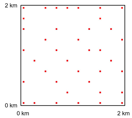 The optimal wind farm layout used in this work is from Grady et al., shown in Figure 4. This optimized layout is based on a wind speed of 12 m/s uniformly from 36 different wind direction sectors separated by , and each wind direction sector is a 10 degree wind sector. For example, wind direction sector is a wind sector ranging from to . The diameter of the 39 turbines is m, hub height of 60 m, and . These parameters are shown in Table 1. The optimal layout from this simple wind regime shows turbines evenly spread out throughout the domain and that there are no turbine clusters. We will be performing yaw optimization on this layout to study the performance of the RS algorithm.