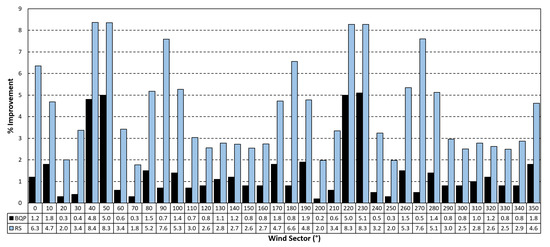 Percent improvement in power production by wind direction sector, comparing proposed random search (RS) algorithm and binary quadratic programming (BQP) model [59] for m.
