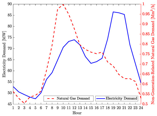 Finally, Figure 2 depicts the 24-h total non-generation-related gas demand and the total electricity demand.