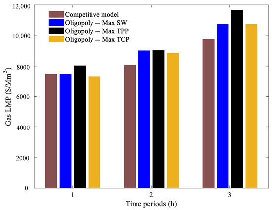 - The oligopolistic model that maximized TPP resulted in lower SW but higher TP than the oligopolistic model that maximized SW. This is because the model that maximized TPP allowed producers further exercising market power, which yielded higher gas and power LMPs.