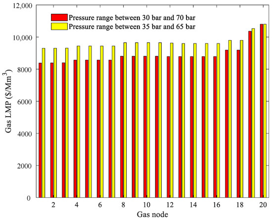 We investigated the impact of gas-pressure limits on the market equilibria reached. This was done by comparing the results obtained from two cases, in which the ranges of nodal gas pressures were between 30 bar and 70 bar and between 35 bar and 65 bar, respectively. Table 7 and Figure 6 summarize the equilibrium results obtained from the two cases. These results indicate that a strict gas-pressure limit resulted in 1) a lower TPP, TCP, and SW, 2) higher gas LMPs, and 3) lower profits of agents 1 and 2 obtained from the power market owing to increased fuel cost for gas-fired units.