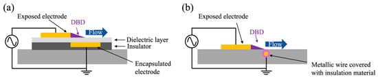 Control of flow around bluff bodies has been studied both actively [1,2,3,4] and passively [5,6]. Bluff bodies are the representative shapes in some parts of various types of actual fluid machinery. Although success is guaranteed when using passive flow control techniques [5,6], an active flow control technique using a plasma actuator (PA) is of interest to the current study because of its advantage [3,4]. Figure 1a shows a schematic illustration of a typical PA. The basic structure of PA was firstly developed by Roth et al. [7], and it consists of a dielectric sheet and a pair of exposed and encapsulated electrodes. When a high voltage current (AC) between electrodes is applied, dielectric barrier discharge (DBD) occurs near one side edge of the exposed electrode. Then, the air around the edge is partially ionized by DBD, and the electric fields formed around the electrodes accelerate the charged particles. As a result, momentum transports due to the collision of the ionized particles with the surrounding neutral particles, and it develops into a one-way tangential jet. The induced flow jet is advected in the direction from the exposed electrode to the encapsulated electrode. This typical PA, called the “sheet-type PA” to distinguish it from the “string-type PA”, used in this study.