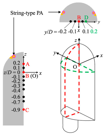 Figure 2b shows a schematic drawing of the model and internal structure in the x–z cross section. In a previous study on the flow around a car door mirror model conducted by Kato et al. [22], the separation point at Re = 105 was approximately 70 degrees. Juke et al. [30] tried to control the flow around a two-dimensional cylinder with sheet-type PAs and indicated that a sheet-type PA located slightly upstream of the separation point was effective in mitigating flow separation. In consideration of this information, for constructing a flush mounted string-type PA, concave grooves (1.5 mm wide, 1.6 mm deep) were molded at the position 60 degrees from the stagnation point, which was presumed to be slightly upstream of the separation point. A copper wire (Cu wire) coated with silicone rubber (outer diameter: 1.3 mm, Cu diameter: 0.6 mm) was buried into the groove, and moisture-curable silicone was filled in the gaps between the model and wires to prevent a step with the mirror model surface. In addition, a conductive epoxy was filled in a V-shaped groove provided upstream of the wire for constructing the exposed electrode. A lead wire bonded to the exposed electrode and embedded Cu wire coated with silicone rubber were derived from inside to outside of the model through a midair hole of the support and connected to the power supply. From a safety perspective, high voltage AC was applied to the Cu wire, and the exposed electrode was connected to the ground (GND).
