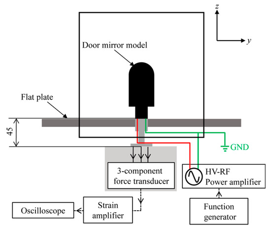 Aerodynamic drags acting on the model under various PA driving conditions were measured using a three-component force transducer (Kyowa Electronic Instruments Co., Ltd., LSM-B-5NSA 37-P, rated capacity: 5 N). The experimental setup of force measurement is illustrated in Figure 6. Each component force in the x (drag), y, and z axes measured by the three-component force transducer was converted to an analog voltage signal by a strain gauge built into the dynamic strain measurement system (Kyowa Electronic Instruments Co., Ltd., DPM-911B), and then recorded by a digital oscilloscope (Tektronix Inc., DPO-4034). Time series of three component forces were acquired at a sampling rate of 1000 Hz, and here, the drag coefficient (CD) was evaluated with an averaged value for 60 s (60,000 points). The CD is defined as follows: