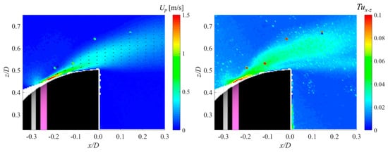 Time-averaged velocity and turbulent intensity distributions under quiescent flow condition in the x–z cross section (y/D = 0.0): velocity magnitude (Up, left) and turbulent level (Tux-z, right).