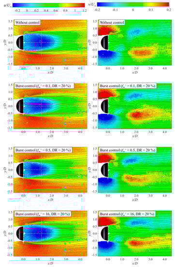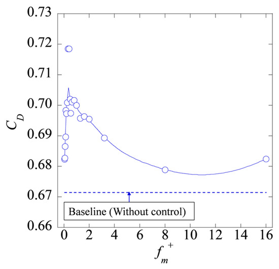 Variations of CD under different conditions of burst control were compared in Figure 18 (CD as a function of fm+ under fixed DR = 20%) in order to understand the relationship between CD and the results of velocity and pressure distributions. On the whole, CD under any flow control condition by PA was increased in comparison with that under no control (baseline) illustrated by a dashed line. In the ranges of 0.40 ≤ fm+ ≤ 0.64, where Cp on the back surface of the model decreased most as presented in Figure 17, CD reached its maximum value and increased from 4% to 7% compared to that without control.