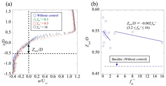 In addition to the x–y section, Figure 12 shows the time-averaged velocity distributions (u, z-axis velocity(w)) in the x−z cross section at y/D = 0 in the cases of without flow control and with burst control (fm+ = 0.1, 0.5, 16 with DR = 20%). It is also found that the recirculation region in the x–z cross section is reduced by driving the string-type PA and the wake approaches the flat plate side. This is because a strong downwash from the tip of the model generates in the wake structure (i.e., negative w region that is indicated by a dashed line in Figure 12). This downwash is formed at approximately x/D = 1.5 without control, and the distance from the model surface to the downwash region in the x-direction is changed due to the flow control. When fm+ approaches 0.5, the distance reaches the minimum. Figure 13a shows u profiles normalized by U∞ at x/D = 1.25. As shown in Figure 13a, the height of the recirculation region in the z-direction (Zrev/D) is defined as the distance between z/D = −0.5 and the location at which u/U∞ changes from a negative to a positive value. Figure 13b plots the Zrev/D as a function of fm+. Unlike Xrev/D and Yrev/D, the change of the Zrev/D due to the flow control is not significant.