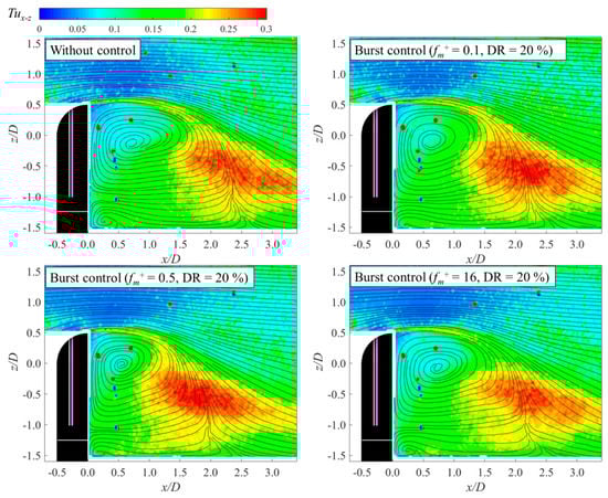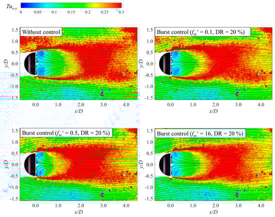 Figure 14 and Figure 15 visualize the distribution of the turbulent intensity at z/D = −0.5 in the x–y cross section and at y/D = 0.0 in the x–z cross section under the without flow control condition and the burst control condition (fm+ = 0.1, 0.5, 16 with DR = 20%). In the x–y cross section without flow control, a region with large velocity fluctuations for Tux-y > 0.25 was observed in the location where the separated shear layer was formed and in the wake near x/D > 2.0. Whereas, just behind the model, the velocity fluctuation was low (Tux-y < 0.1). Under the burst control of the string-type PA at fm+ = 0.5, the region Tux-y > 0.5 was observed in the wake near x/D < 1.0, and it extended to the back surface of the model. At the same time, the region where Tux-y < 0.1 had shrunk. In addition, the burst control driving the string-type PA at fm+ = 0.5 promoted the growth of the shear layer and reduced the length in the x-axis direction of the shear layer, which was attributed to the enhancement of the entrainment of the separated flow. In the x–z cross section, as in the x–y section, the region of large fluctuation was enlarged, and the x-axis direction of the shear layer was shortened by the same driving condition.