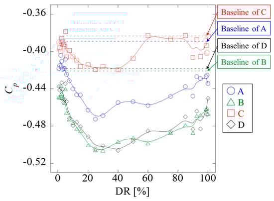 Cp as a function of duty ratio (DR). Symbols A, B, C, and D indicate measured positions on the model surface shown in Figure 5.