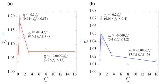 Figure 22 shows the effects of fm+ on the surface pressure and drag force acting on the model. The change of γp with respect to the variation of fm+ correlates with the change of γD with respect to the variation of fm+. Also, although the γD varies due to the flow control, γD becomes larger than that in the cases considered. These results mean the drag forces acting on the model increase in comparison with that of the case without the control. The γp and γD firstly increase in the ranges of 0.04 ≤ fm+ ≤ 0.53, then both reach their maximum value at near fm+ = 0.53 and start decreasing with an increase in fm+. When fm+ becomes larger than three, the changes of γp and γD are not significant. The maximum increase in CD is approximately 7% compared to the case of without control.