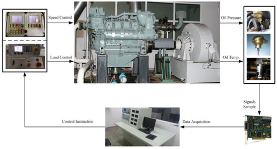A diesel engine usually consists of several subsystems. The lubrication system is a crucial system to guarantee the safe and reliable operation of a diesel engine. The poor working conditions of a lubrication system can lead to abnormal wear or even some major safety accidents [23,24], e.g., cylinder score and the journal sticking of a diesel engine. Accordingly, the lubrication system was taken as the research object in our study to simulate the faults and illustrate the proposed engine fault detection approach. The lubrication system of this marine diesel engine consisted of several parts, including a gear pump, an oil filter, an oil cooler, and several valves with various functions. Normally, the working condition of an engine lubrication system is described via oil pressures and temperatures at various points. Therefore, a set of sensors were configured on the engine to acquire the oil pressures and temperatures of the engine lubrication system. The main working parameters of an engine lubrication system are shown in Table 2. In this engine test cell, the sensor signals were sampled and pre-processed by using a National Instruments PCI-6225 data acquisition (DAQ) system. The schematic of the engine test cell is shown in Figure 1.