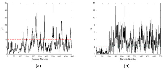 The engine lubrication system faults mentioned in Section 2 were re-studied by using a multivariate statistics-based approach. In this study, the training data set was constructed based on the engine’s healthy condition with a sample size of 500. In total 400 samples were acquired as a test data set for each kind of fault, i.e., oil leakage, oil filter clogging, and a low oil level. All faults were introduced at the 101st sample point. Figure 4 shows the detection results for oil filter clogging at a 75% full load and 1800 rpm, Figure 4a presents the monitoring chart of Hotelling’s statistic, and Figure 4b shows the monitoring chart of the statistics.