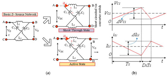 Impedance source inverter operation: (a) impedance source circuit, shoot through (ST) state, an active state, (b) inductor current and capacitor voltage idealized condition waveforms.