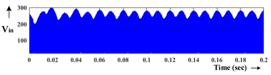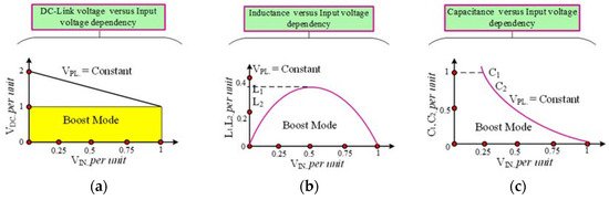 According to Figure 2, the impedance-source network has two modes of work. During the mode-1, inverter switch is short-circuited to provide the charging loop for an inductor with input DC source. This state is called the ‘shoot-through (ST) state’. The second mode is the active mode, where energy stored in the inductors is supplied the load via inverter active mode switching. To connect this ST state with regular inverter active switch, there are a variety of modulation methods available. The modulation methods are distributing the ST states equally based on the modulation index of the inverter (Ma). The upper limit of the modulation index is 1-DS. For the maximum boost modulation method, the modulation index is operated in extensive range (Ma ≥ 1); however, the state involves larger (high rating), passive (L and C) elements [8], and correspondingly distributing the active states, the Ma has its maximum Ma ≤ 1–DS [14]. Therefore, VC1 = VC2 = VPL. During this time, high-frequency generation in the active states causes higher frequency ripples, as shown in Figure 2a. According to the characteristics of Z-source inverter boost mode operation, the performance of inductor and capacitor components and DC-link voltage estimation related to input voltage function are shown in Figure 2b. From the characteristics curve, it is understood that the inverter matches the maximum DC-link voltage with the least input voltage. The inductor curve has a challenging dependency with ST time, and the quick capacitance value raise with the decreasing input voltage is essential. Hence, it is noted that passive elements (inductor and capacitor) are carefully chosen based on the input source voltage and power profile. The voltage rating capacitors are required since the voltage across the capacitors is always greater than the input voltage. Similarly, starting current and voltage surge happens because of the enormous inrush input current. Due to the resonance conditions, these surges are not avoidable, and the absence of bidirectional and soft-start capability limits the application for conventional Z-source topology.