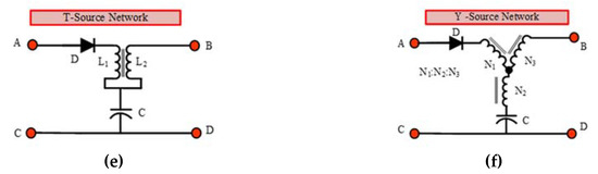 Different Z-source topologies; (a) Z-source network, (b) Quasi-source network, (c) Modified Quasi-source network, (d) Trans Z-source network, (e) T-source network, (f) Y-source network.