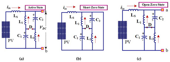 States of proposed Q- impedance network topology; (a) State-1: active state, (b) State 2: shoot-through states, (c) State-3: open-zero states.