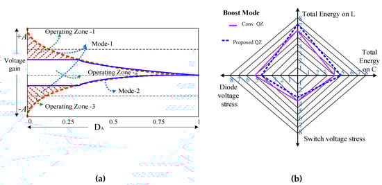 (a) Converter operation in different modes, Vboost / input voltage (VPV) for duty cycle DA, (b) energy storage capability and voltage stress radar graph of conventional QZ and proposed QZ.