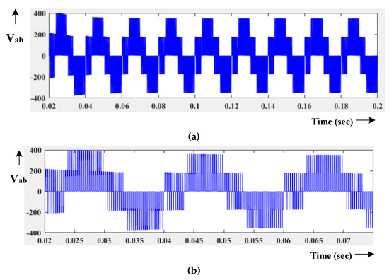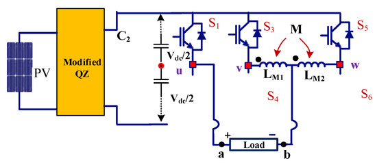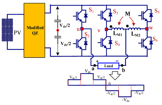 Additionally, the interleaved converter reduces the size of passive components (inductors and capacitors), and the output voltage harmonic profile is considerably increased [28,29,30,31,32,33,34,35,36,37,38,39]. Banaei et al. discussed the switching stress reduction in Z source-based MLI [36]. Alexandre Battiston et al. deliberated the withdrawal of the ripples in the input current with the suitable coupled inductors arrangement [37]. Li et al. proposed the use of the cascading magnetic cells to obtain a high voltage gain [38] and investigated the voltage gain achievement against smaller duty time. Followed by the authors, Lei et al. offered optimized pulse width modulation (PWM) technique with reduction of switching loss, current ripple, low total harmonic distortion (THD) and high boost gain [39]. The space vector PWM is extensively reviewed for impendence sourced VSIs and MLIs [40,41,42,43,44,45,46,47,48,49]. The creation of shoot-through (ST) and placing them in the active switching states, these PWM methods perform better than other carrier-based PWM methods. The ZSI space vector PWM is also studied with two-level MLIs for altering the active and ST switching vector in the space vector diagram for the enhancement of inverter output [44]. However, when connecting a coupled inverter with an impedance network, the PWM methods need to be modified.