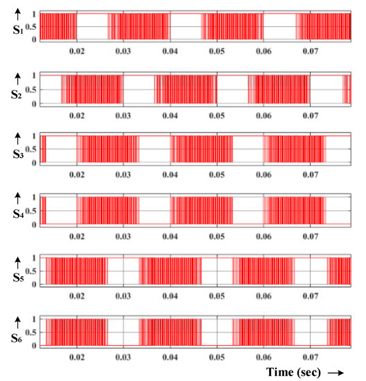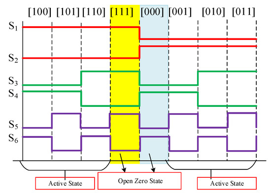 The Space Vector PWM is a continuous switching PWM technique, which explicitly selects the active and zero states placed within the carrier period [30]. While designing for the boost converter circuitry, the vector-based algorithm possesses the additional switching states which must be imposed to acquire a higher voltage gain in the traditional impedance source inverters. It may lead to impact the switches in the form of stress or failure of a switch [8]. While looking into the traditional strategy, the upper and lower switch combination must be short as the voltage gain may impose distortion on voltage. The proposed space vectors consist of normalized state operation, which generates the voltage gain by operating u, v, w legs upper or lower switches, as shown in Figure 10. The condition ST is incorporated with the regular zero vector operation. The projected control algorithm realizes the least number of switching operations to improve the efficiency of an inverter over one switching cycle, as indicated in Figure 18. The operation time for each period and every switching cycle of the dead time for short-zero as well as open-zero states, should be pre-calculated. The six modes (Mode-1 to Mode-6) of switching states are aligned with active vector and Mode-4, and Mode-5 are placed in zero vector.