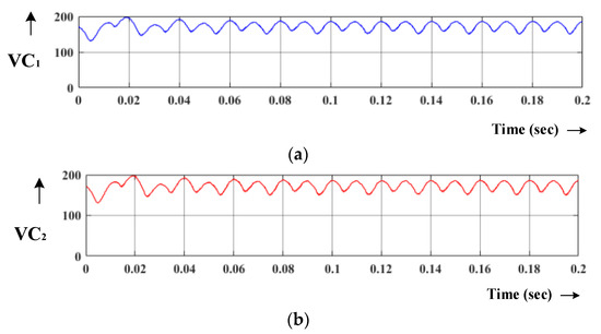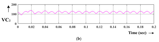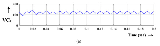 State-1: Figure 7a shows the active states of the inverter. This mode assumes inductors, L1 and L2 and capacitors, C1 and C2 with chosen identical values as VC1 = VC2 = VC, VL1 = VL2 = VL to maintain a symmetrical output nature. The Kirchhoff’s voltage law is applied in Figure 7a,