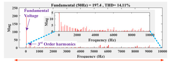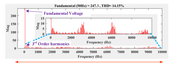 The experimentation is carried out for the 500W constant PV power for 100 V and 5 amps current. The impedance network duty ratio is maintained at 25% with the aim of inverter constant DC-link voltage 300V. The inverter operation is investigated with its modulation index range ma = 0 to 0.866. Initially, the inverter is operated with maximum ma = 0.886, and the results are captured. Figure 41 shows the PWM pulse of inverter switches S1 and S2. The ST time between switch S1 and S2 is represented, in which the 25% switching time is used for ST event, and hence impedance network can generate 300% boosting to maintain the DC-link voltage. Figure 42a shows the current waveform of impedance network inductor L1 and L2. Figure 42b displays the voltage waveform of impedance network capacitors C1 and C2. The voltage profile across the impedance network capacitors VC1 and VC2 are indicating that variation in the VC1 and VC2 are identical. It can be observed that voltages VC1 and VC2 are equally charging the voltage since both are connected in series. Hence the proposed impedance network can provide regulated DC-link voltage to the inverter. Figure 43a,b shows the inverter output voltage (without filters) and input voltage waveform at ma = 0.866. The results show the measured five-level inverter voltage with symmetrical set output voltage 0V, ± 125 V, ± 250 V. The THD value of load voltage is captured using power analyzer and is found to be about 17.1% (shown in Figure 44). The same experimentation is investigated further with filter, and the results are captured. Figure 45a,b shows the filtered output load and load current respectively, where the current and voltage are maintaining their THD lesser as 3.1% and 1.4% respectively (Figure 46a,b).