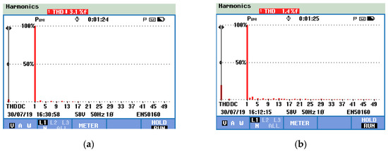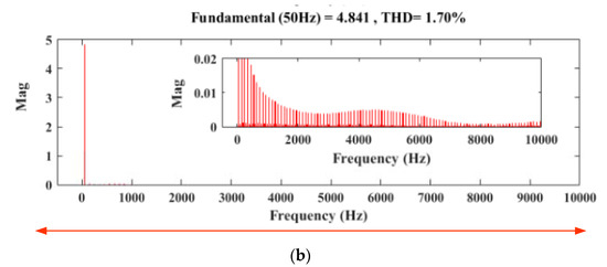 Experimental result; (a) voltage THD spectrum with filter, (b) current THD spectrum with filter.