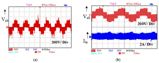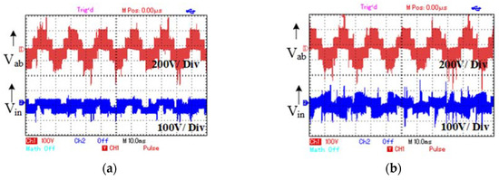 Experimental result; (a) quasi Z-source coupled MLI output voltage and input current at DST = 25%, (b) quasi Z-source coupled MLI output voltage and input current at DST = 30%.