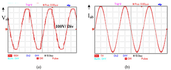 Experimental result; (a) inverter output voltage with filter, (b) inverter output current waveform with filter.