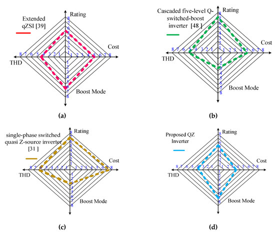 Passive components rating, cost, boosting, and THD comparisons; (a) Reference [39], (b), Reference [41], (c) Reference [39], (d) proposed QZ Inverter.
