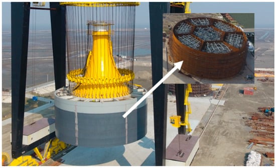 The bucket foundation, as a new type of offshore foundation, has become an emerging research hotspot in the field of offshore wind power due to its characteristics of high efficiency, low cost, resource saving, and environmental friendliness [,,]. Combined with the advantages of traditional bucket foundations and gravity foundations and considering the geological characteristics (soft clay, silty clay and find sand) of wind farms of china, a new type of wide-shallow foundation and one-step transportation and installation method for the foundation, called the large-scale composite bucket foundation (CBF), was proposed by Tianjin University and Daoda Company, as shown in Figure 1. The CBF is composed of an arcing transition of reinforced concrete, a beam-plate system, and a honeycomb bucket. The arc transition ensures that the various loads from the upper tower structure are successfully transmitted into the foundation and converted into small tensile and compressive stresses. A series of studies on the bearing capacity and dynamic response of CBFs have proved that CBFs have great advantages for bearing the large bending moment loads from wind turbines [,,,,,]. As of October 2010, the first CBF for a fully operational wind turbine was installed at the offshore test facility in Qidong City, in the eastern part of Jiangsu Province. The wind turbine is a XEMC 2.5 MW turbine with an 80 m hub height. The diameter and the bucket skirt length of the CBF are 30 and 7 m, respectively, with a total foundation weight of nearly 2200 t and an 18 m arc transition structure of pre-stressed concrete [].