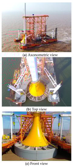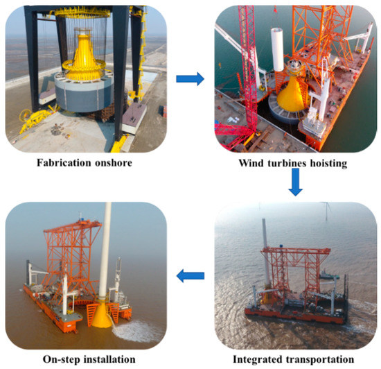 However, offshore wind power in China is still in the early stage of a large-scale development. Improving technical quality and building the industrial chain, as well as quickly realizing parity, are both important and challenging. The construction period and costs of offshore wind turbines are still much greater than those of onshore wind turbines due to the limitation of the window periods for offshore construction. Traditionally, the construction process of an offshore wind turbine is divided into two parts: foundation construction and wind turbine (tower, nacelle, and rotor) hoisting. Such a construction method is easily affected by wind, waves, currents, and other environmental loads during the hoisting process. What is more, the installation of foundations (such as the piling of single pile and the hoisting of jacket foundation) and the hoisting of wind turbines require a large floating crane or a jack-up hoisting platform. With the increase in offshore wind turbine capacity and installation water depth, the requirements for construction equipment also increase. The limitation offshore construction capacity and construction equipment also restrict the large-scale development of offshore wind power in China [,,,,].