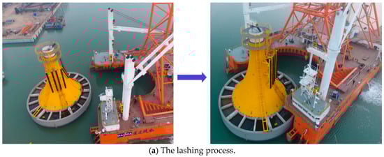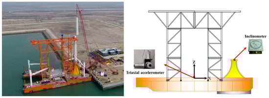 The onshore process of hoisting and the commissioning tests for wind turbines at dock in an inner harbor is the key process sequence to achieve the one-step installation of CBFs and wind turbines, as shown in Figure 6. During the process of hoisting turbines’ structures on the shore, a CBF is fixed on the vessel, which moves due to the actions of waves and tides, bringing instability to the tower hoisting process. Therefore, as a turbine tower is lifted, a three-way acceleration sensor and a biaxial inclinometer are used to monitor the motion of the vessel. As could be seen from Figure 6, the water in the harbor was very calm. According to the observation, the wave height was always less than 10 cm, so the wave was not measured and statistically calculated during the hoisting process.