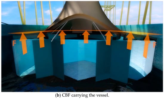 The bucket of a CBF is divided into seven compartments by bulkheads, forming a honeycomb subdivision structure. Enough compressed air is pumped into the seven compartments to generate buoyancy, which not only balances the weight of the CBF but also generates net a buoyancy of about 500 tf. The net buoyancy generates pre-pressure between the bottom of the vessel and the top of the beam-plate system, ensuring that the vessel and CBF will not move in relation to each other. In addition, there are also several wire ropes between the vessel and the CBF as a safeguard. As a result, the vessel and CBF are tightly connected so the “CBF carries the vessel”, as shown in Figure 3.