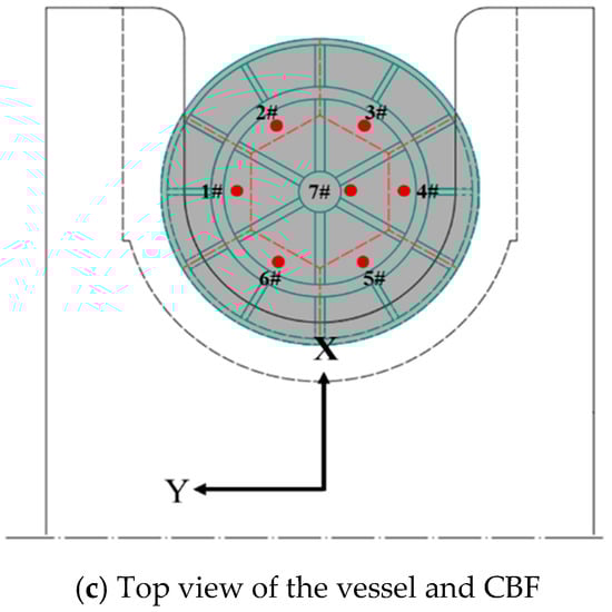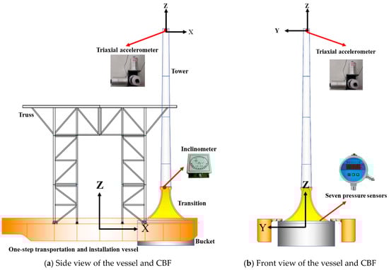 As mentioned above, the CBF and OSTIV were closely combined to achieve a synchronous and coordinated movement of the whole structure. In this paper, the assumption has been put forward that the deformation of the structure is small and can be ignored, that is, the structure is equivalent to a rigid body supported on the spring coupled by the compressible air cushion and water cushion. A biaxial inclinometer was installed in the top flange of the CBF to monitor the roll and pitch angles of the structure during transport. A three-way acceleration sensor was positioned on top of the test tower to measure the acceleration on top of the tower during towing. The axes were the same for the accelerometer as for the inclinometer. Seven pressure sensors were installed at the top of seven rooms to monitor their internal air pressures. The net force on the CBF can be obtained as the difference between the buoyancy force and the weight of the CBF. The installed set of sensors is shown in Figure 5, where (a) and (b) are the arrangement of the inclinometer and the acceleration sensor, respectively, and (c) displays the mounting position of seven pressure sensors. In particular, the acceleration sensor was positioned at the midpoint of the vessel deck during the lifting process.