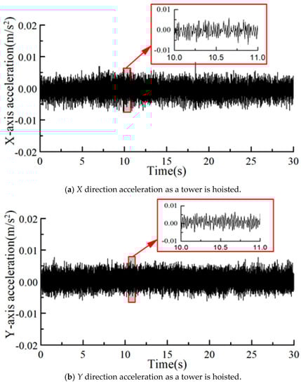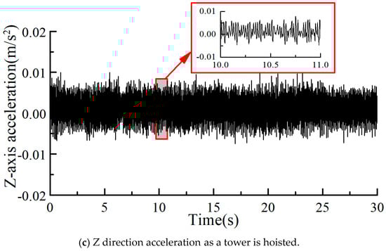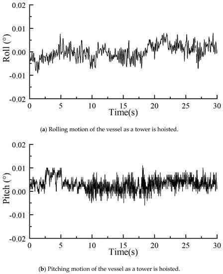 Figure 7 and Figure 8 are the 30 s time series for acceleration and the roll and pitch motion before and after the contact between the tower and the CBF. It can be seen from Figure 7 that, as the tower is hoisted, the triaxial acceleration of the vessel was less than 0.01 m/s2, and there is no significant change in the triaxial acceleration over the course of the hoisting process. The roll and pitch angles were much less than 0.02°. Since the wave load is very small and the same mass of a single tower only accounts for 0.41% of the total mass of the structure, the hoisting of the tower did not cause the visible fluctuation of the vessel. In conclusion, the whole structures have good stability and stay in an adequately stable position during hoisting.