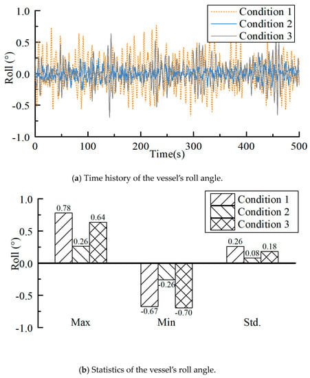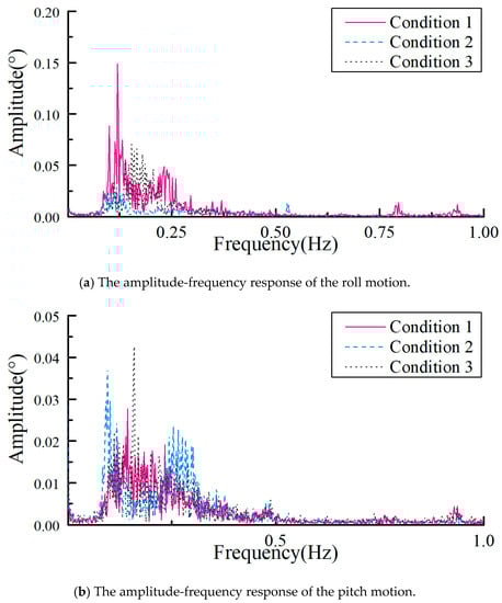 Figure 11 shows the amplitude-frequency response of the vessel and the CBF’s roll and pitch motions during transport. As could be seen from Figure 11a, the roll amplitude peaked when the natural rolling frequency of the vessel was 0.12 Hz. Another peak value was at a frequency of 0.23 Hz in Conditions 1 and 3, from which we can infer that this was the dominating wave frequency. The peak values appeared in a range of about 0.16 Hz in Condition 3, which was speculated to be due to a higher wave height and a longer wave period. However, because the vessel was anchored in Condition 3, the rolling motion was less than that of Condition 1. As shown in Figure 11b, the pitch motion natural frequency is 0.09 Hz, meaning that there are several peaks in the amplitude-frequency response curve of pitch around 0.09 Hz. In Condition 2, the vessel encountered head waves, meaning that the pitch motion generated by waves was, relatively speaking, larger than that in other conditions. However, due to the small pitch motion response, the peak value is not prominent in Conditions 1 and 3.