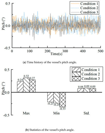 The roll and pitch motions of the vessel will lead the fluctuation of the air pressure and compressed air volume inside the bucket. The air in the bucket will leak when the vessel’s roll and pitch angles are too large. Moreover, the CBF bound at the bow and the stern of the vessel rose or fell as a single object due to pitch motion of the vessel during the towing process. That is, the foundation would have a heaving type of motion, which would lead to drastic changes in the buoyancy of the foundation and affect its safety. Figure 9 shows the time history and statistics of the vessel’s roll angle during transport. It can be seen that the roll angle under all working conditions never exceeds 1° and is less than 0.5° in most cases. Time history and statistical values of the pitch angle of the vessel are shown in Figure 10. As can be seen from Figure 10, the pitch of the vessel was always staying within a small range, which was most of the time less than ±0.3°. To ensure no leakage of the air, the vessel’s pitch angle should be less than 4.6° and the roll angle should be less than 2.3°. The results of the monitoring data show that the ship’s motion meets the requirements. The statistics of roll and pitch motions are listed in Table 3. According to this comparison for Conditions 1 and 2, it was shown that wave height has less influence on the pitch of the vessel than on the roll in the case of the same wave height, because the length of the vessel is twice as long as its width, so the pitch stiffness is greater. The results show that the vessel response in roll was larger with the small wave’s Condition 1 than in the larger wave’s Condition 3. This was because the ship was in the state of anchoring in Condition 3, and the anchoring system provided a certain recovery force, which increased the vessel’s rolling stiffness.