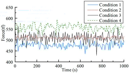 Enough compressed air is pumped into the seven compartments of the CBF to generate buoyancy, which not only balances the weight of the CBF but also generates net buoyancy of about 500 tf. The net buoyancy generates pre-pressure between the bottom of the vessel and the top of the beam-plate system, ensuring that the vessel and the CBF will not move in relation to each other. The interacting force (around 500 tf) between the vessel and CBF are generated by the net buoyancy of the bucket. During transport, the fluctuation of interacting forces is mainly caused by the motions of the structure under load and the fluctuation of air pressure in the bucket. Figure 12 shows the time histories of the interacting forces for 4 conditions. It can be clearly seen from Figure 12 that the interacting force was above 400 tf from beginning to end under four conditions, indicating that the CBF and vessel are securely connected and with a large safety reserve under the action of environmentally induced loads.