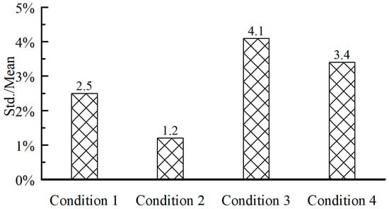 At the same time, it was necessary to ensure that the fluctuating values of the interacting forces do not have excessive peaks, which could cause damage to the vessel and the turbine’s foundation. Statistics for the interacting forces are shown in Table 4 and Figure 13. It was found that the standard deviation of the interacting force under Condition 1 is twice that seen under Condition 2. The reason is that the vessel’s roll motion in Condition 1 was much larger than that in Condition 2, although the pitch motion response was very close. Contrasting Conditions 3 and 4, the standard deviation did not change significantly when the wave height increased by 1 m. This was because the air pressure inside the bucket was maintained at a high level during Condition 4, and the pressure fluctuation caused by the external load was small. As a result, the change of the interacting force caused by the air pressure in bucket was small.