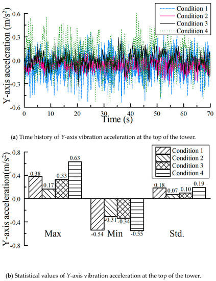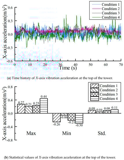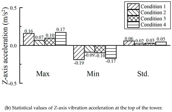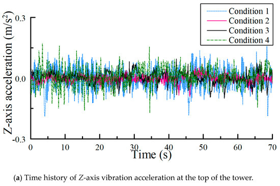 The time history and statistical values of the three-way vibration at the top of the tower under four conditions are shown in Figure 14, Figure 15 and Figure 16. The maximum values are shown in Table 5. It could clearly be seen that during the transport process (Conditions 1 and 2), the horizontal acceleration values during the whole process were always less than 0.05 g. It can be seen from Figure 14 that the statistical trend of acceleration in the Y-direction is similar to the roll motion, which indicates that the acceleration in the Y-direction is mainly generated by the roll motion of the vessel. Similarly, the acceleration in the X-direction is due to the pitching motion of the ship. The vertical acceleration values were always less than 0.02 g, much less than the limiting values of 0.25 g and 0.2 g. Even with a wind speed of level 8 and a wave height of 3 m, the horizontal acceleration after anchoring is no more than 0.08 g and the vertical acceleration is no more than 0.02 g. The results also showed that the one-step installation method of the CBF and wind turbine can meet the specified limits for tower vibration.