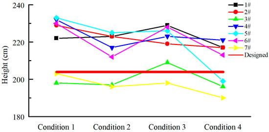 Since the CBF is an air-cushioned structure, it was necessary to ensure that the liquid level in the bucket was high enough so that the air in the bucket would not leak out from the bottom during towing. Radar level gauges was used to measure the height of the liquid level in seven compartments of the bucket, and the measurement results are shown in Figure 17. It can be concluded from the figure that the height of the liquid level was always more than 190 cm, which ensured that the gas in the cylinder would not escape from the bucket. Moreover, the fluctuation of the liquid level can be calculated from the fluctuation of the interaction force with the roll and pitch angles of the vessel, indicating that relatively stable buoyancy can be provided.