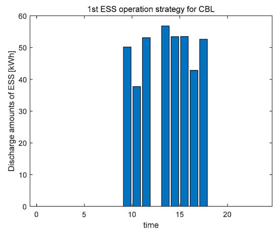 Consequently, two ESS scheduling patterns are suggested, and they are developed using the probabilistic model and the CBL. The ESS specifications are assumed to be 500 kWh capacity, with an 80% depth of discharge 80%; meaning that the lower limit of the ESS state of charge (SOC) is 10% and the upper limit is 90%. Moreover, the wear-out cost is not considered here. The first pattern is the probabilistic method; according to the probabilistic model (Figure 1); 10 a.m. has the highest potential for the occurrence of a morning DR event, and 4 p.m. exhibits the highest potential for an event in the evening. As the probability of a DR event is relatively higher, if the ESS is expected to discharge relatively less power during this time, the remainder of the capacity can be used for DR situations. For example, if the ESS discharge pattern for a CBL is 40 kWh at 10 a.m., as shown in Figure 2, about 360 kWh can be used in a DR event, while approximately 350 kWh is available at 9 a.m. Thus, the high probability of a DR event leads to low discharge patterns for the CBL; Figure 2 confirms that the results reflect these expectations. Another method involves shutting down the ESS for five days before the CBL, it means there is no variation in ESS scheduling during five days. This strategy necessitates a participant to refrain from operating the ESS when a DR event day is predicted. In this case, the opportunity cost should be considered because the participants would have derived benefits from arbitrage if they had not chosen this method.