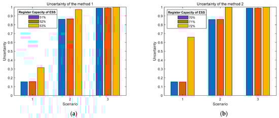 Uncertainty by ESS register capacity of each method: (a) method 1, (b) method 2.