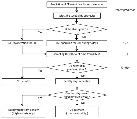 In summary, each participant can predict the DR event day on a yearly basis, and the three scenarios show the prediction results. Five days before the DR event, the participants control their ESS scheduling patterns to comply with their participation method. On the day of the DR event, they guess the DR event time by sampling from the GMM probabilistic model. If their predictions are correct, then their participation in the DR ends successfully. However, as the process of DR participation through ESS is based on a series of forecasts, the uncertainty from forecast failure is not negligible. Figure 4 shows the process of DR participation through the ESS.