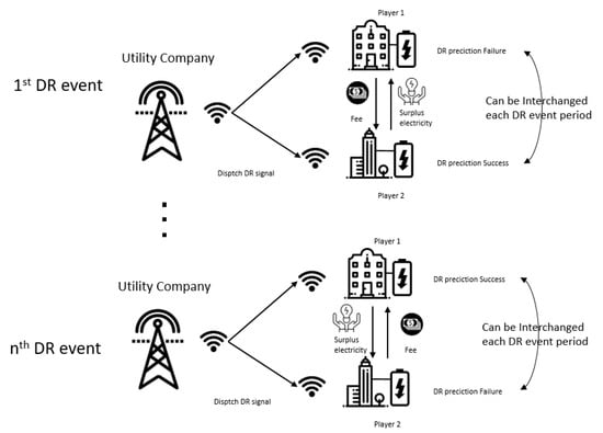 To sum up, an IET occurs when a DR signal is dispatched, where some participants are unlikely to respond to the DR. Furthermore, since each participant’s DR prediction success rate is assumed to be the same, each participant becomes either a buyer or a seller every time a DR event occurs. The overall schematic of the IET is illustrated in Figure 5, and the DR event n is determined by the scenario. For example, n = 5 for scenario 1, n = 15 for scenario 2, and n = 25 for scenario 3.