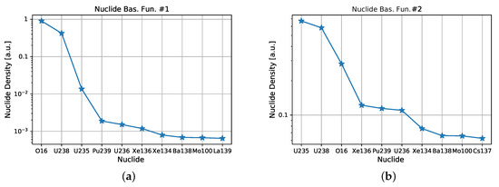Nuclide basis function shows O as the first nuclide, which comprises UO, fresh fuel. Indeed, oxygen is not a neutron absorbent, and its concentration remains high along the entire burnup history; i.e., O is also present as the third isotope in the basis functions and . Furthermore, fissile and fissionable nuclides provide important contributions for the basis functions , , and .