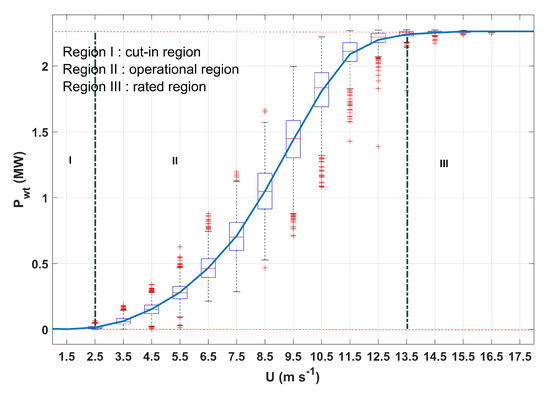 Once the inflow of the wind turbine is characterized and a power curve is generated, the resulting power curve can then be used for predicting power generation from the turbine. An example wind turbine power curves is shown in Figure 1, which consists of three main regions: cut-in region (I), operational region (II) and rated region (III). In this study we focus on the operational region of the power curve and wind speeds less than 11 m s−1. More information about power curves and how they are generated can be found in [19,21,30].